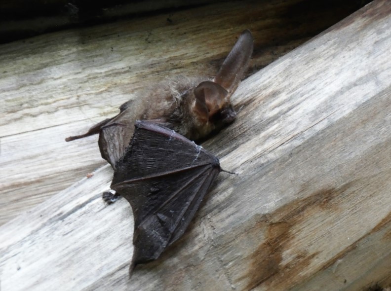 (Plecotus auritus) Fourteen species of bat have been recorded at Botany Bay. The Brown Long-eared Bat catches food by plucking insects from surfaces such as leaves and may hover to do so. This species may be hard to detect with a bat detector as they echolocate at very low, quiet, frequencies. In summer they often roost in buildings, and this individual was found in the roof of the Botany Bay shelter.