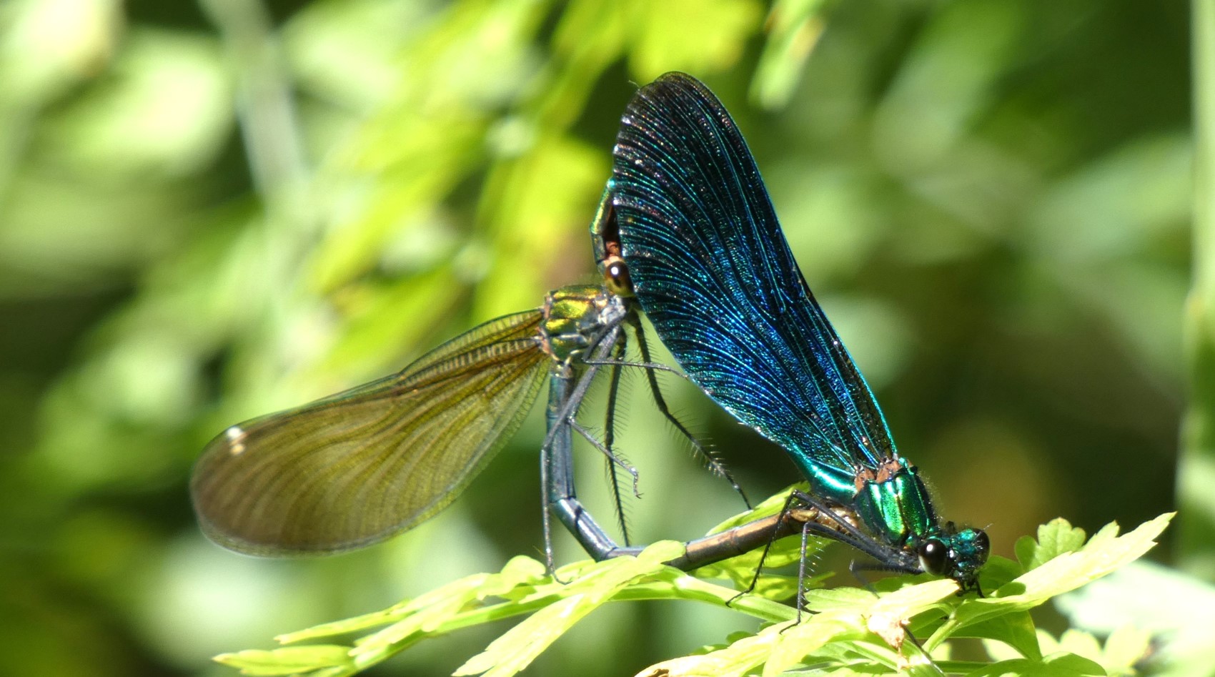 (Calopteryx Revirgo) These are stunning damselflies, the male with metallic blue body and wholly dark-coloured wings, the female with metallic green-bronze body and translucent pale brown wings. Beautiful Demoiselles prefer running water with shingle bottoms, while the similar Banded Demoiselle prefer slow running waters with a muddy bottom. Both species are found at Botany Bay and may be most easily seen on the stretch of the stream between the two bridges. This photo shows a mating pair in the ‘wheel position’.
