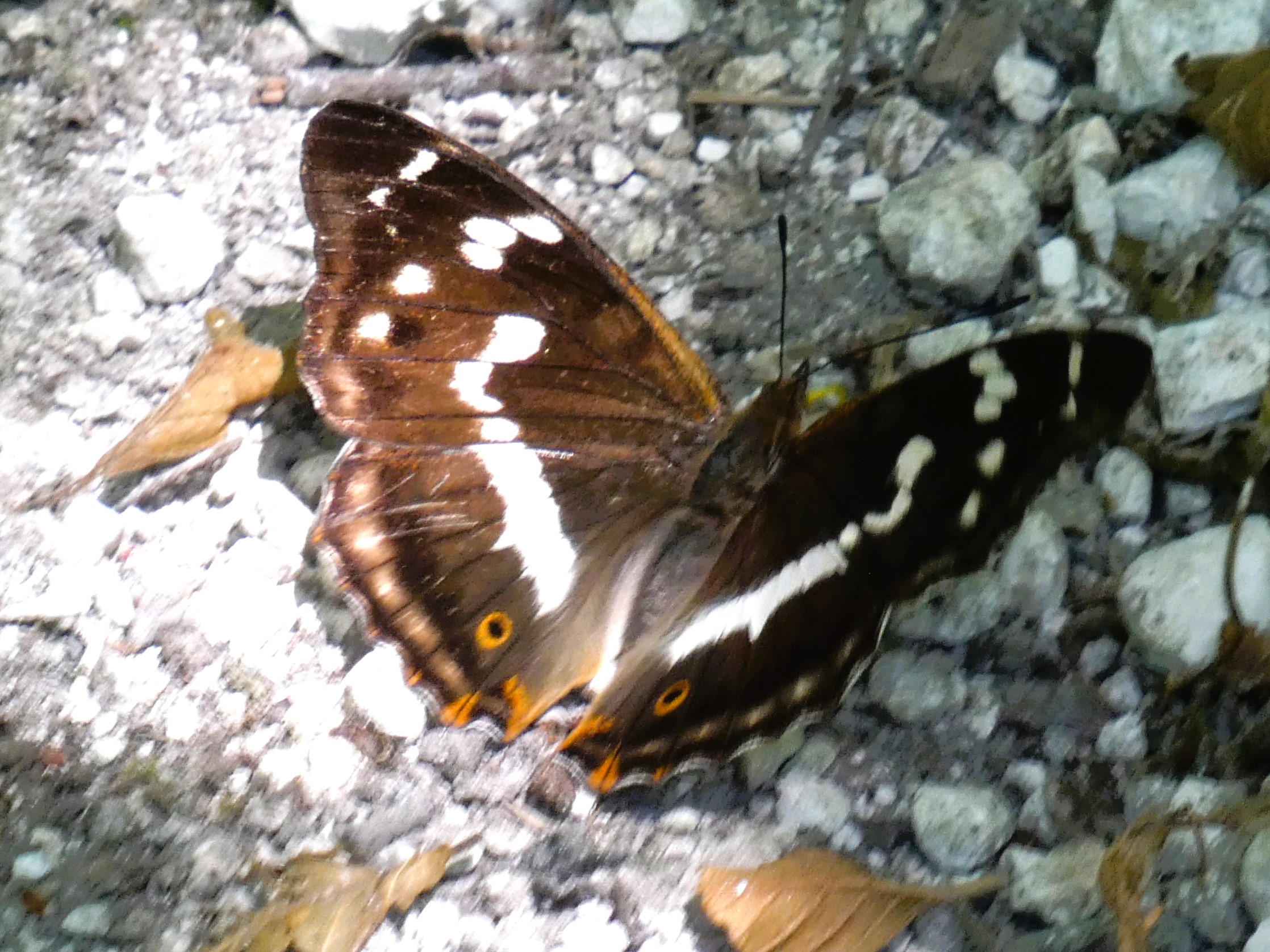 (Apatura iris) This is the largest of the British butterflies, the female being larger than the male, and may be found flying from late June to early August. The males are an iridescent blue, but the females a rich dark brown. The males spend most of the flight season high in the canopy, often in groups, overlooking the larval food plant, sallow, searching for females. Occasionally the butterflies come down to the ground to take minerals from mud or decaying materials, such as the one depicted here.