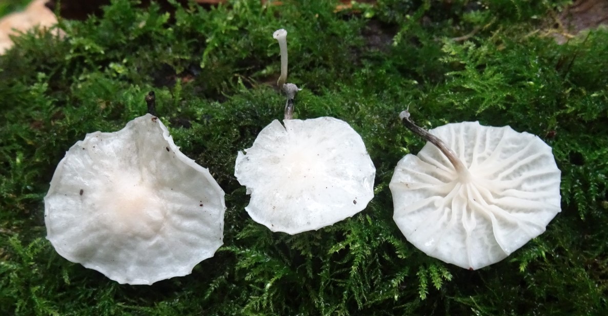 Fairy Parachutes, Marasmiellus candidus, are very delicate fungi only about 1cm diameter. They often grow on twigs and other woody debris. At Botany Bay we found them massed on a large fallen willow trunk. A very similar but commoner species growing here is the Collared Parachute, Marasmius rotula. This has a ‘collar’ at the top of the stem which the Fairy Parachutes do not.