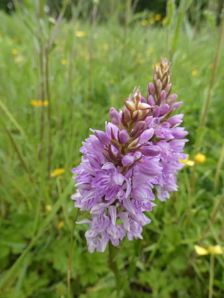 (Dactylorhiza fuchsia) Although one of the commonest orchids, there were few at Botany Bay until part of the meadow was developed for wildflowers. Common Spotted Orchids are now on the increase there. This year a single Pyramidal Orchid appeared in the same area.